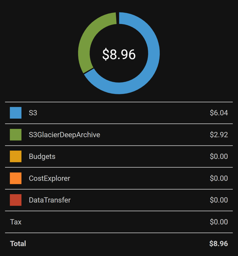 As long as you know something about how AWS works, AWS Glacier Deep Archive seems like a viable option to store data you don’t plan to ever need to recover again. If it’s just there as a safeguard against catastrophe, it might be a good option. However, I’m going to save my final judgment for after I get the costs sorted out. For the first 11 days this month, I’m already at $9, which is significantly higher than the $3-4 I was expecting.